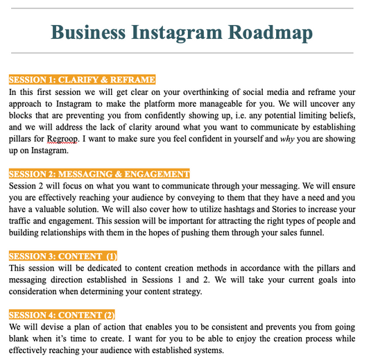 After determining we were a good fit to work together, I sent an outline of proposed sessions based on her specific goals of gaining clarity on her messaging and content.