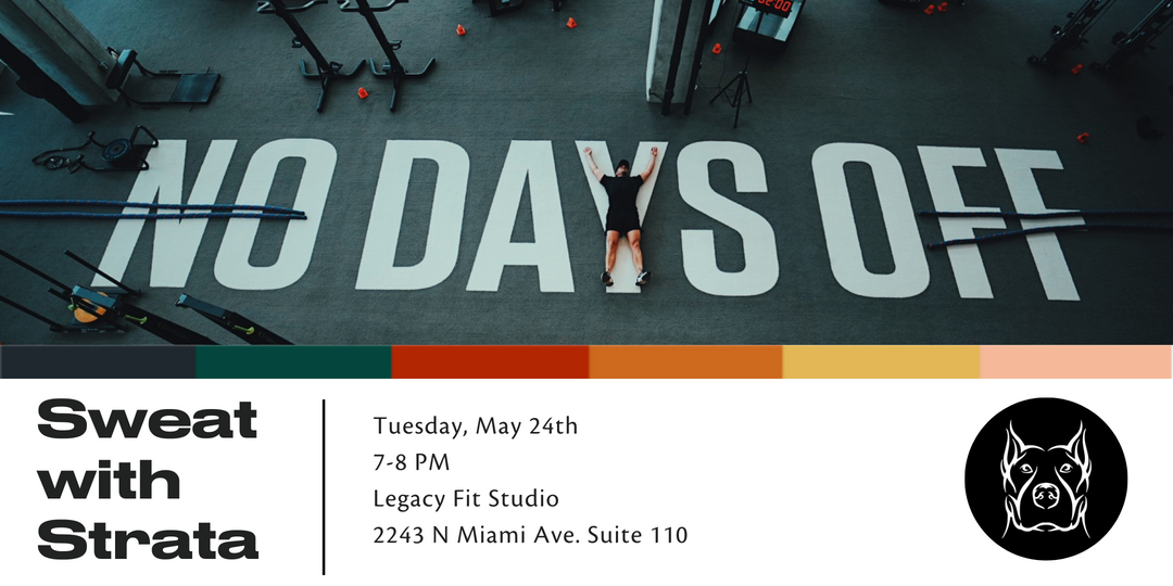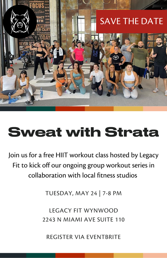 Promotional materials created for Strata Wynwood's community activation, Sweat with Strata: HIIT with Legacy Fit, as promoted on Eventbrite and via the property's email list